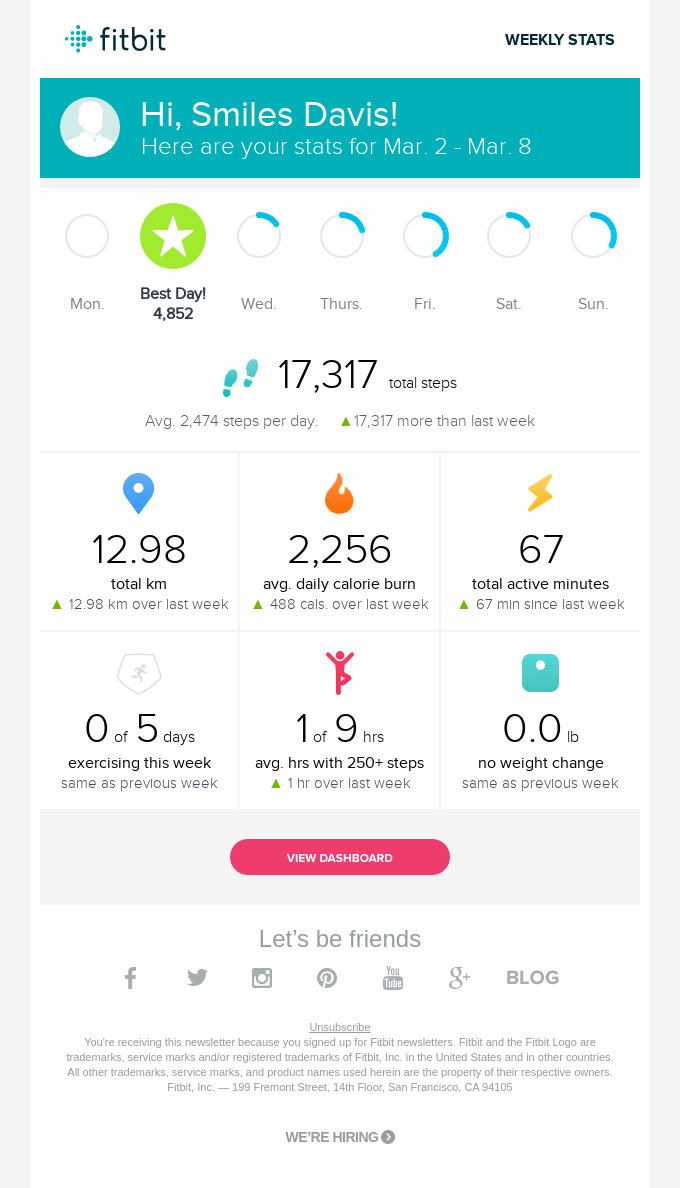 Fitbit sends weekly stat emails like this based on user activity. The user tracks their fitness activity on their device or in the app and can customize their goals in their profile. This personalization is a great example of how to keep your audience coming back for more with your products.