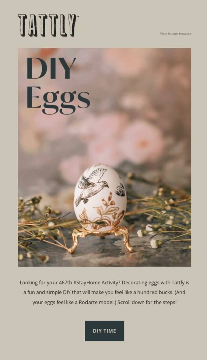 Remember those temporary tattoos you used to find in cereal boxes or spend your coins on in prize machines? Well, Tattly shows readers how to get creative with their high-quality temp tattoos in their newsletters, like this one: how to decorate an egg.
