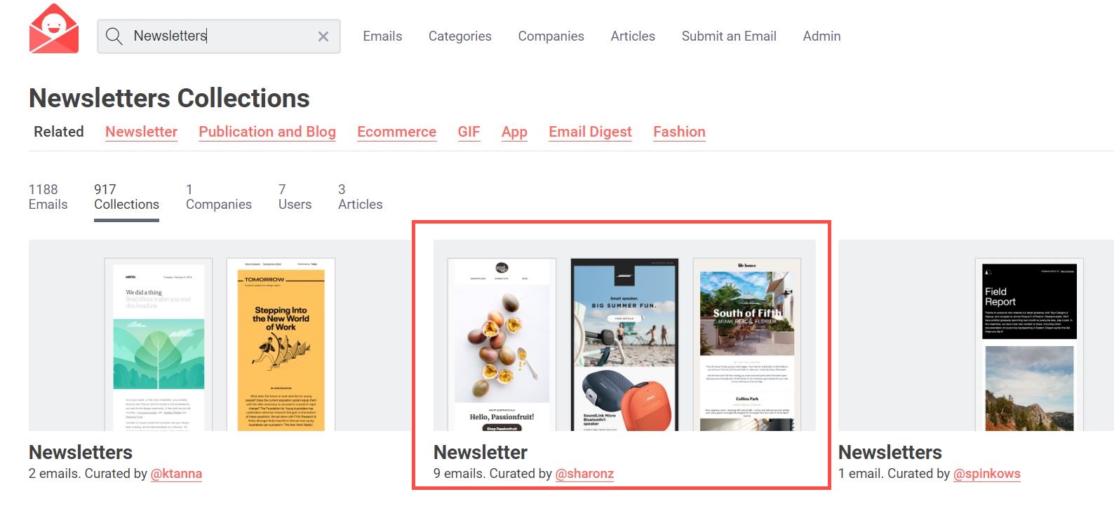 Email Collections are a group of emails created by Really Good Email users. Think of it as a custom inspiration board with your favorite emails from a specific category all in one place. You can browse Category Collections, such as “Newsletters,” you can create your own Email Collection, and you can browse other users’ Collections.
