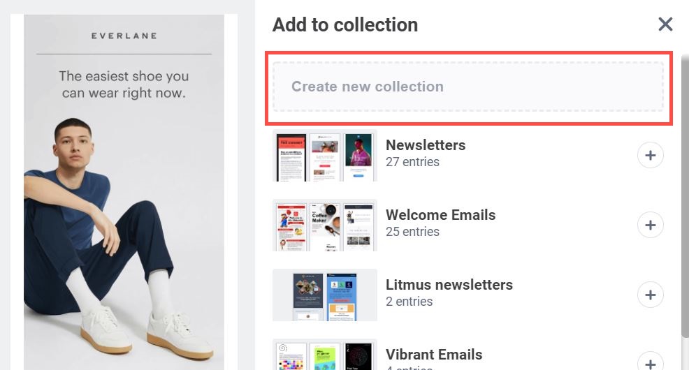 - To add an email to an existing Collection, navigate to the email, click “+ Collect” and then click the plus sign to the right of the Collection you want to add the email to.