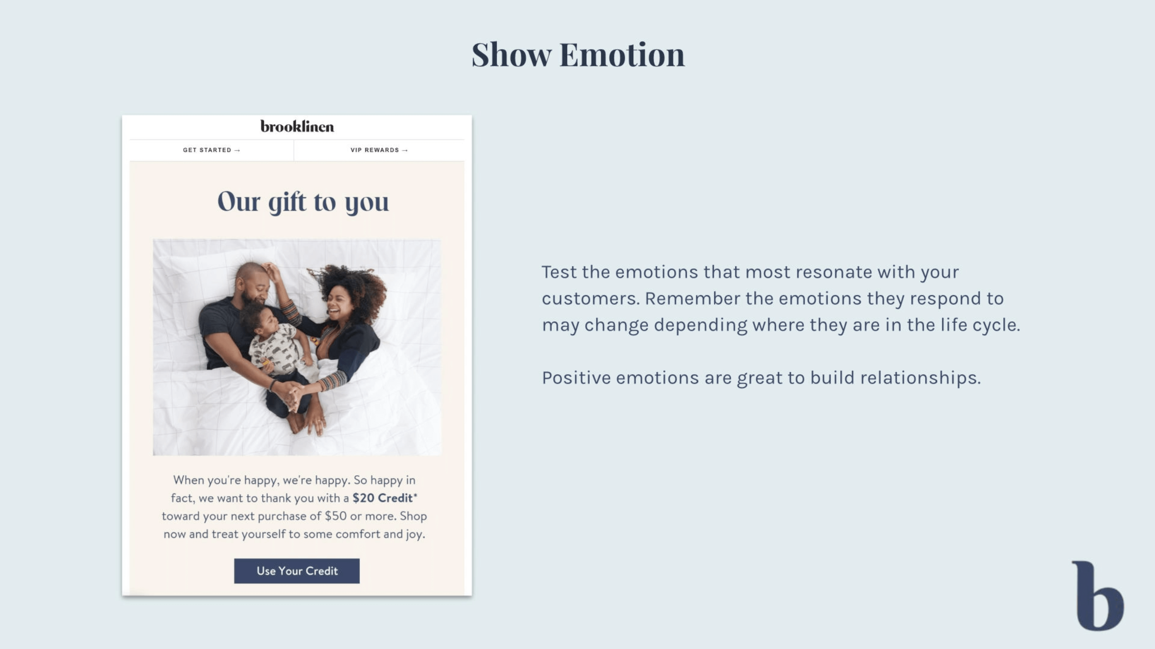 I will give you some tips that we're using. All the email examples are, unfortunately, Brooklinen. Sorry, but I'll be honest, they were the easiest examples to get a hold of.