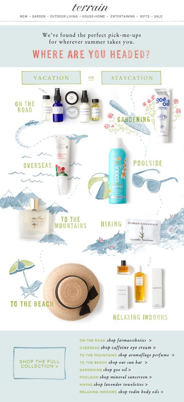 Terrain draws readers in with a fun mix of creative illustrations and product photos.