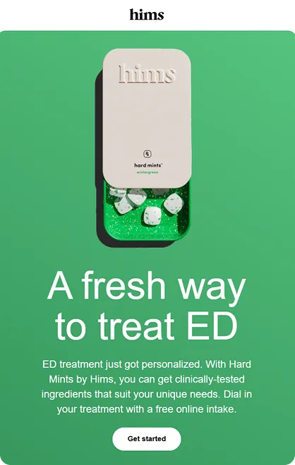 Julia Papanek: I love this email. It was a launch for our new Hard Mints product. I worked on the GIF with one of our motion designers, Carolyn Crenshaw. It was essential to demonstrate how the tin works—it’s one of the key differentiators. It’s not a typical ED pill; it’s a hard mint, so it’s more fun and playful. Showing the tin sliding open and revealing the mints was essential for the launch.