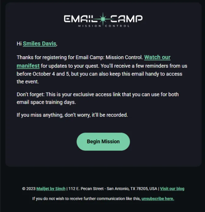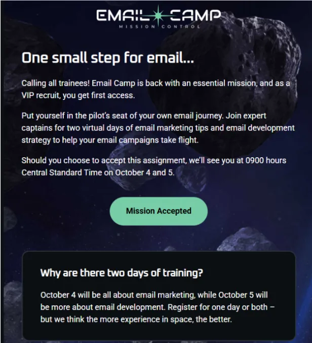 Matt Helbig: Awesome. Great. Well, the first email we received from Email Camp was actually from last year, 2023, and the theme this year was Mission Control—got that space theme. Would you like to review some of the key points in this email and discuss what you liked about it?