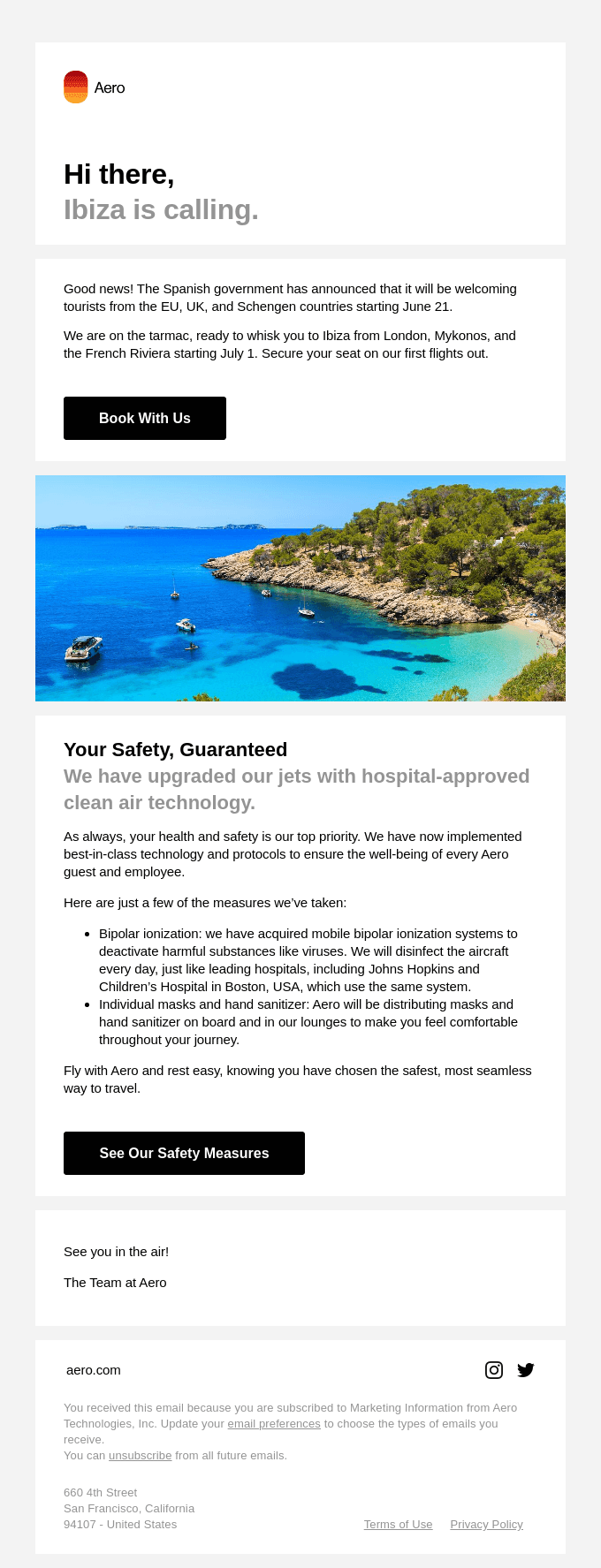 3. Explain the details of what you're promoting and the features you offer in a clear way. For example, lead into a section with icons (the airplane seats in this Aero email), and then explain the feature in a short paragraph below the icons.