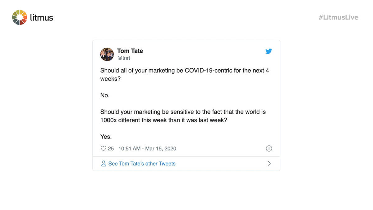 And you think, how do I do that for email marketing? That's the wrong question. Instead think what frame of mind is a user, my audience, my customer. Kristin and brought up a wonderful comment, earlier today when we were talking, is that we're all experiencing this exact same thing together worldwide, which is a really rare experience, right?