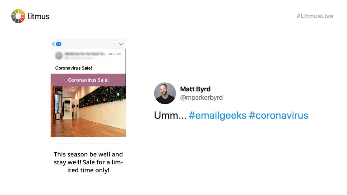 Kristin Bond: Yeah. None of us are sending emails in vacuum. I mean, you saw those screenshots of the inbox earlier. We're all getting lots of emails from other brands right now. So if you do send something that's really out of touch, it's going to stick out and people will notice, and you may have a high open rate, but not for the reasons you want.