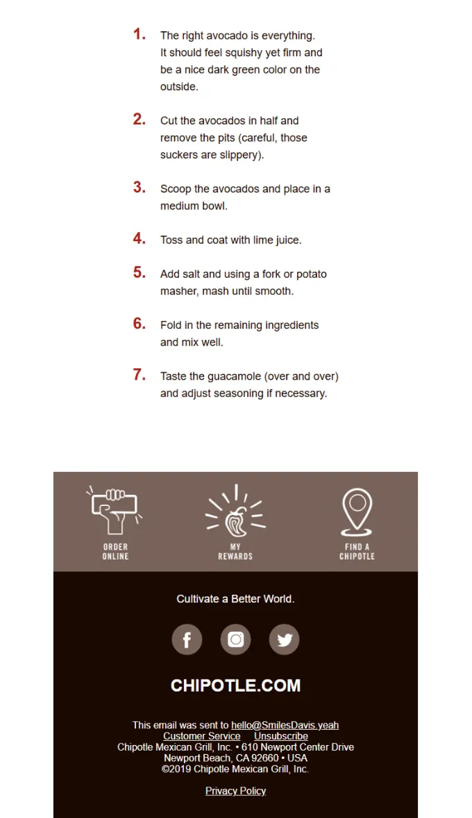 Matt Helbig: The numbered list is what really stood out to me. We rarely see that in an email. I guess a recipe is one of the main use cases for it. It’s a really cool idea to include it directly in the email instead of linking out to a landing page. It’s easy to follow if you want to make some guac yourself.