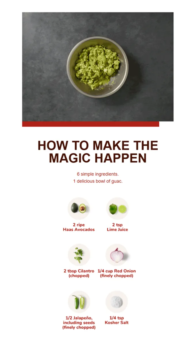 Matthew Smith: Yeah, it’s a nice visual hack. They’re also using the red from their brand throughout — in the video section and on the CTA — and I think that’s strong. “Yes, I want the guac.” Again, they’re using the same callout style. I’m curious — they’re doing something slightly different here than in the previous section. I’m not sure why. This one feels like it’s further along in the video; there’s a white line, and now there’s no play button. Maybe they’re testing which one gets more clicks. That’s interesting. Then they lead me quickly down the page to this recipe, or more accurately, a set of recipes. It just feels great to have that insight. The images look good — the picture of the ingredients is obviously an image, but the text doesn’t need to be. That could have been done differently, but it’s fine.