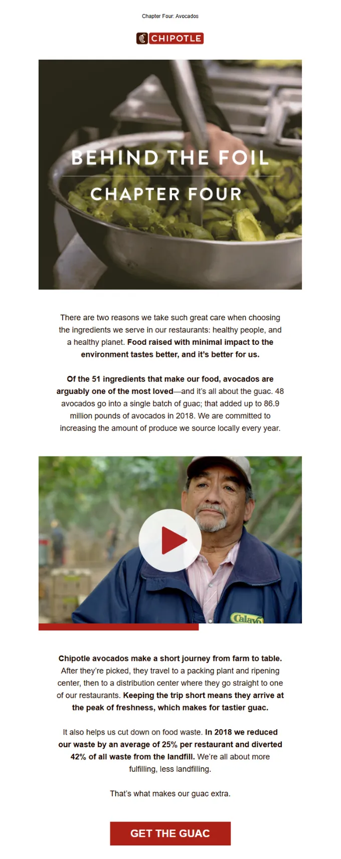 Matthew Smith: Oh my God, I love Chipotle. I’m pretty into this. This is a great example of a fantastic GIF. It’s supporting imagery that just feels fun, right? If they had used a still photo, it wouldn’t be nearly as meaningful. I think they did a great job with that. I love it. Also, holy cow, that’s a lot of avocados, and it makes me hungry. I think they’ve done a nice job here with a lot of different elements. The one thing I notice right away is that this text gets very close to being too long for centered alignment. It’s nice and big, which helps, but that could become problematic. If it were me, I’d find a way to make it left-aligned.