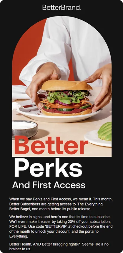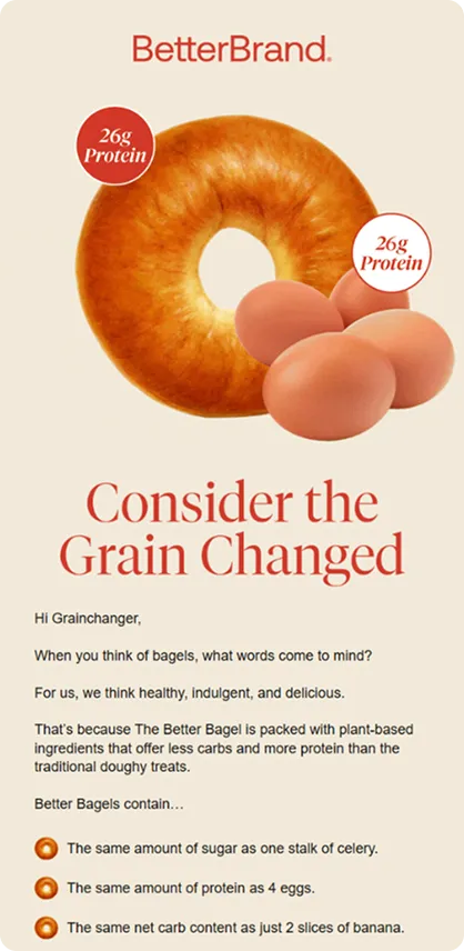 How do you make bagels look this good in an email? For Better Brand, it comes down to bold design, sharp storytelling, and a touch of food tech innovation. Known for reinventing the classic bagel with high protein, low carbs, and plant-based ingredients, the brand brings that same “too good to be true” energy into the inbox.