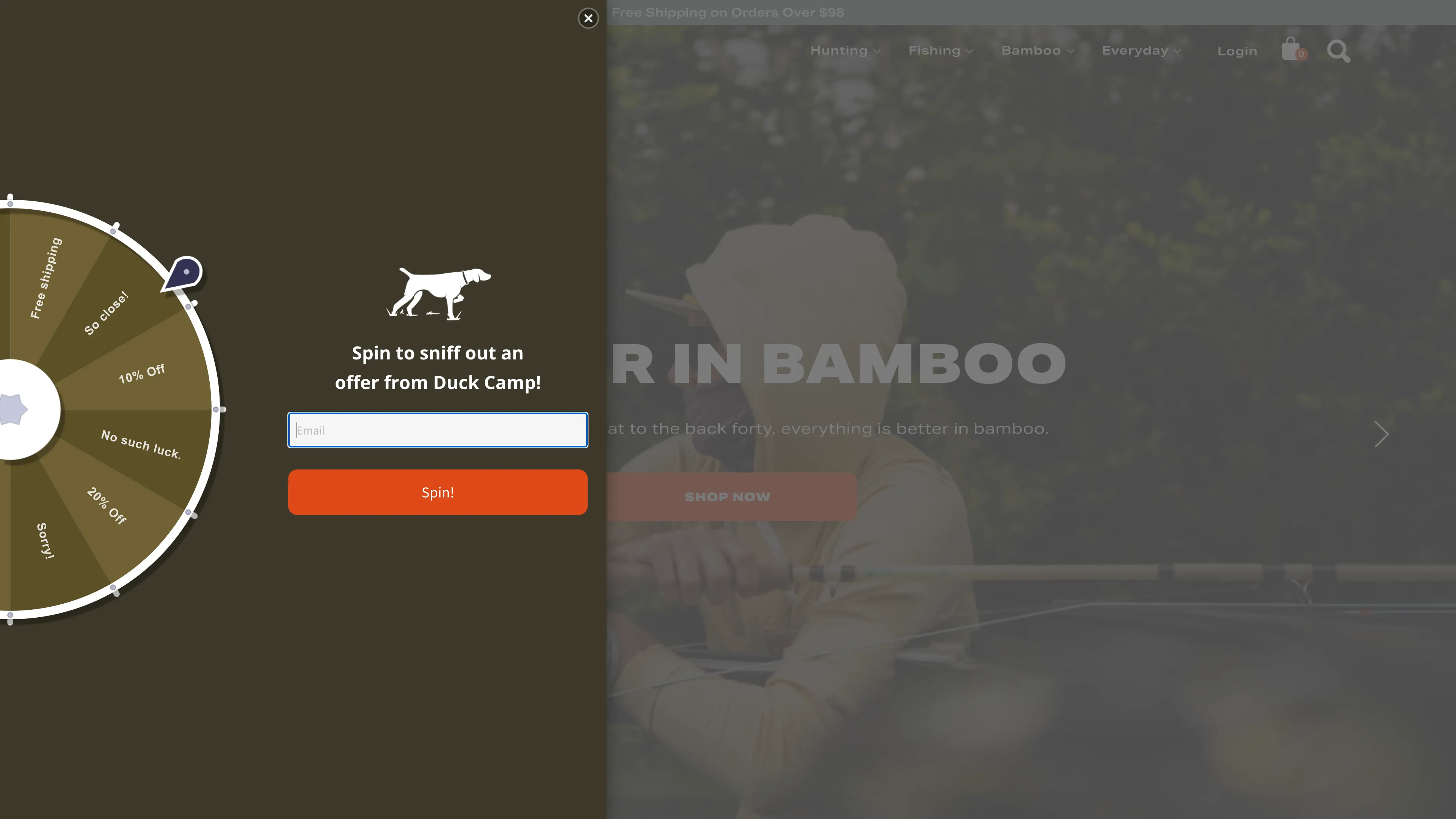 This is really simple, it's from the side. One thing I would recommend on this promotion design-wise, and every promotion actually, is adding an additional close button underneath the spin button, only because we don't want to interfere with the experience. We've decided to play something in the way and we want to make sure it's as easy as possible so it doesn't interfere if they are on a conversion pathway essentially. It’s really simple. It's on-brand and I enjoy the copy on this. I really love when people have fun to brand copy, making things look on brand and making your language speak to your audience is so important.